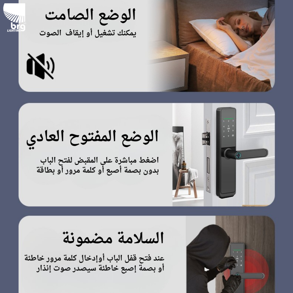 - فتح باستخدام بصمة الإصبع حتى 100 بصمة