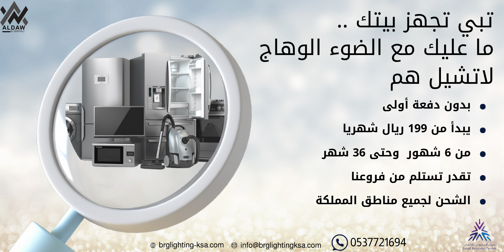 قسط مشترياتك من أجهزة كهربائية و أدوات الانارة و الهواتف و فترات سداد حتى 36 و قسط شهري يبدأ من 199 ريال للتفاصيل تواصل معنا